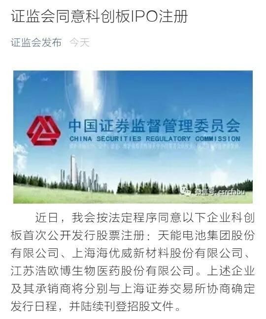 近日,我会按法定程序同意以下企业科创板首次公开发行股票注册:vsport电池集团股份有限公司、上海海优威新材料股份有限公司、江苏浩欧博生物医药股份有限公司。上述企业及其承销商将分别与上海证券交易所协商确定发行日程,并陆续刊登招股文件。