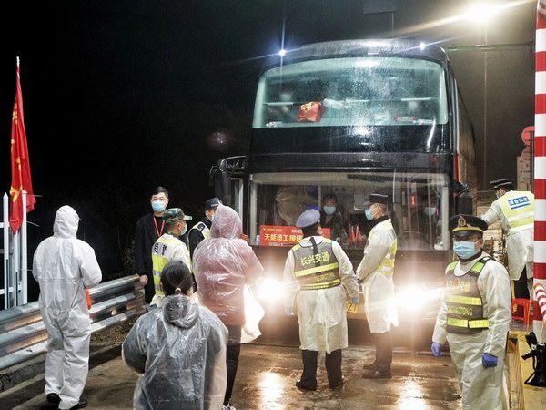 “做好准备,他们到了!”2月14日晚8:30,天空飘着雨,载着25名返厂员工的大巴车缓缓在和平镇高速口停下。